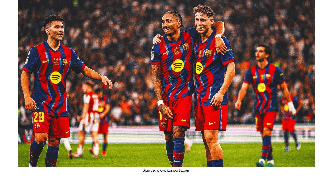 Barcelona powered into the Spanish Super Cup final with a 5-0 win over Athletic Bilbao on Wednesday, with Raphinha scoring twice in a one-sided semifinal played in Saudi Arabia. The match took place at Alinma Stadium in Jeddah, where Hansi Flick’s side overwhelmed their Basque rivals by scoring four times in the first half.
